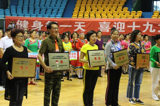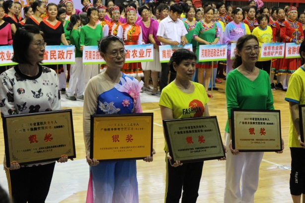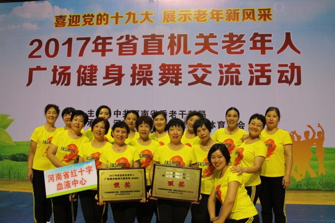 2017年9月27日离退科组织单位退休老同志参加由中共河南省委老干部局主办,河南省直属机关老年人体育协会承办的2017年省直机关老年人广场舞健身操舞交流活动,荣获规定套路和自选套路银奖的好成绩。此次舞蹈我单位共有16名队员参赛,另设替补队员2名,所有队员历时数月时间,不惧酷暑,不讲条件,在前期没有外请教练的情况下克服种种困难、自编自练,互帮互助,圆满完成此次活动,充分展现出血液中心离退休老同志健康向上、积极阳光的精神风采,为单位精神文明创建增添色彩,为庆祝党的十九大的顺利召开献礼!