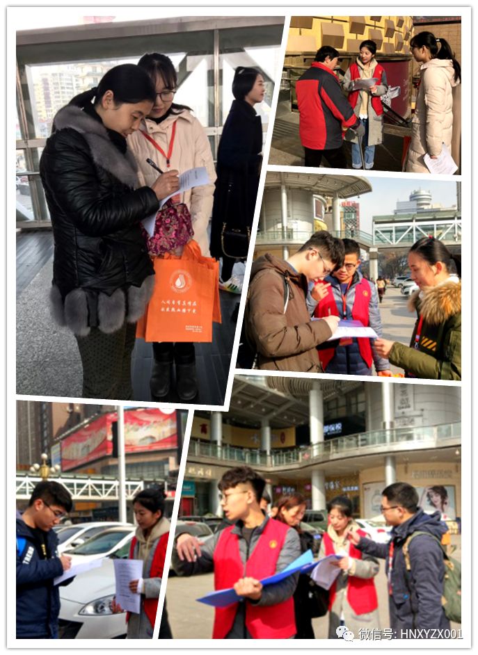 这四天里同学们策划了一项郑州街头无偿捐献单采成分血市民认知度调查。为了保证活动的顺利开展,同学们第一站来到省血液中心接受相关专业知识及发放调查问卷注意事项的短期培训。接着同学们身穿红马甲,走进自己的校园、走街串巷发放问卷。并在20/21日两天和省血液中心的老师们一起在郑州最繁华的二七广场发放调查问卷。