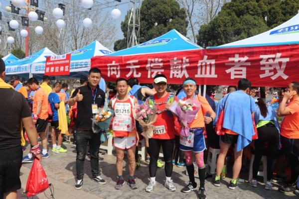 2018年3月25日上午,春光明媚,艳阳高照。在郑开马拉松比赛现场,有三位精神饱满、容光焕发、活力十足的“献血明星”,他们分别是杨泽予、褚廷民、皇甫涛涛,他们不仅是本次马拉松运动员,并且三人还经常参加全国各地的马拉松比赛。更让人震撼和致敬的是,他们三个都是百次献血者。其中杨泽予捐献全血9次3200毫升,捐献成分血227次446个治疗量;褚廷民捐献全血27次9800毫升,捐献单采成分血107次212个治疗量;皇甫涛涛捐献全血5次2000毫升,捐献成分血96次190个治疗量。生活中的他们积极向上,阳光帅气,“健康、奉献、快乐”更是他们共同的人生追求。献血已达200次以上的杨泽予老师在跑完马拉松后分享到:“运动分享健康,捐血分享生命。”
