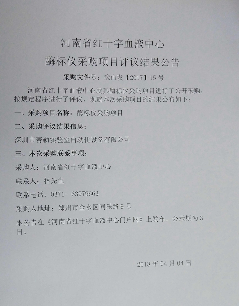 河南省红十字血液中心 酶标仪采购项目评议结果公告