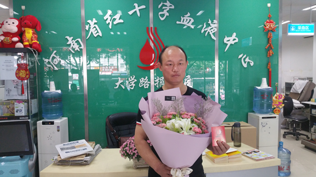 6月5日,郑州市气象台发布高温橙色预警。烈日炎炎,酷暑难当,而献血者娄海峰却不怕酷暑高温来到大学路捐血屋。今天是他第100次献血。据他回忆,他无意中了解到无偿献血,于是在2013年4月28日选择了第一次400ml全血的捐献。一般情况下,对每个人来说,第一次都印象深刻,娄海峰也不例外。他说,在第一次献血过程中,他从工作人员口中了解到还有另外一种献血形式叫单采成分血。对于单采成分血的献血过程让他感到很好奇,也很惊讶。于是在3个月后的7月29日,娄海峰尝试了单采成分血。他说,相对全血而言,单采成分血除了时间长一点以外,恢复快,身体也没有感觉到不舒服。从此,他决定加入单采成分血队伍。每到献血时间后,他就准时出现在采血屋,春暑秋冬,风雨无阻。他说,中间有几次血液初筛不合格,挺遗憾的。在问过工作人员注意事项后,每在献血前,他就格外注意自己的饮食和作息。娄海峰笑着说,既然选择献血,献出这份爱心,就要为自己的血液负责。娄海峰并不善言,从他的笑容中,我们看到了一位普通献血者大爱的情怀。