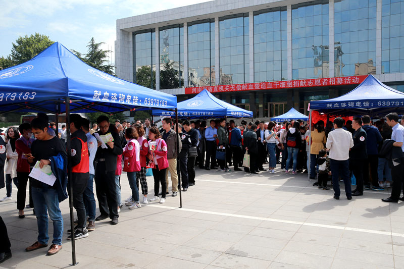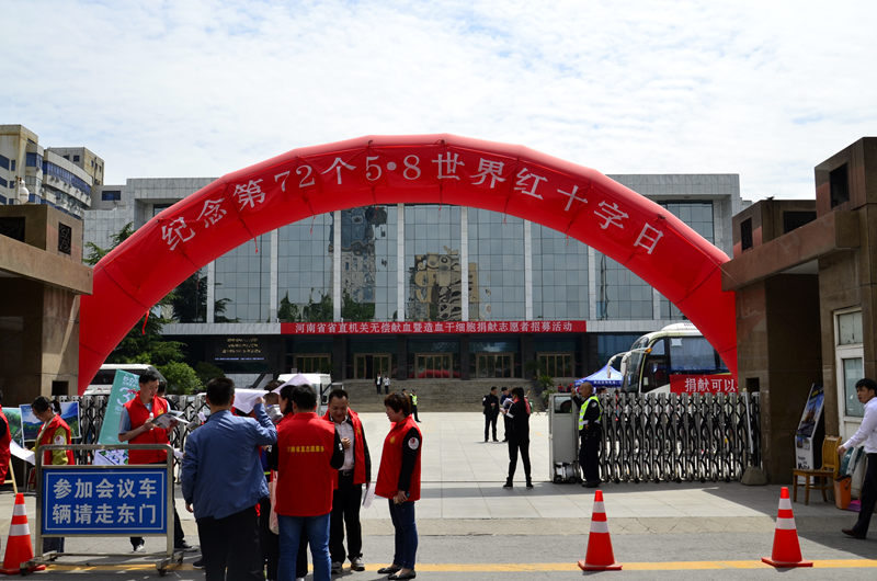 2019年5月8日,是第72个世界红十字日,由省委直属机关工委、省红十字会、省卫生健康委联合举办,河南省红十字血液中心承办的以“博爱中原,文明河南”为主题的省直机关无偿献血暨造血干细胞捐献志愿者招募活动在郑州举行。本次活动在省人民大会堂设立主会场,在省政府综合办公楼院内和省机关事务管理局综合办公楼院内分别设立分会场,5.8活动当天共计1376人参加无偿献血,其中1261人捐献全血427600毫升,115人捐献单采成份血195个治疗量。献血者们用自己的爱心善举传递大爱。