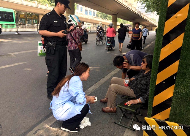 “医生,有人晕倒啦”,正在指导爱心市民填写《献血登记表》的曹蓓蕾看到有人冲到面前,“走,看看”她随手拿起血压计,和那人跑离采血车。在花园路慢车道旁歪倒着一位老人,面色苍白,她的老伴颤抖着身子,在一旁急得不知所措。曹蓓蕾蹲下来,边按压老人的合谷穴边呼喊,老人还有轻微意识。通过其老伴了解到阿姨有冠心病,高血压,糖尿病病史,曹蓓蕾就问是否带有药物,老伴拿出硝酸甘油,赶快让阿姨含服几片。同时为老人测量血压,还在正常范围。这时候采血车工作人员马小龙拿着马扎也跑了过来,大家扶着老人坐起来。工作人员要拨打120,但老人拒绝就医,大家再三劝解,身体要紧,别延误救治,但阿姨还是不同意。曹蓓蕾向阿姨老伴儿要了家人电话,跟家属取得联系。等待过程中老人出现呕吐,软瘫无力的情况,工作人员为老人擦拭呕吐物,和紫荆山执勤特警一起关注着老人的情况,等候着家属。十几分钟后老人的女儿赶到现场,将其带走就医。17日下午五点左右,曹蓓蕾接到老人女儿的致谢电话,得知阿姨病情暂时稳定。