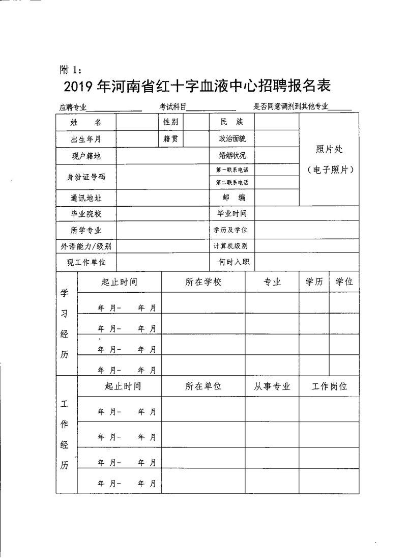 1.《 2019年河南省红十字血液中心招聘报名表》