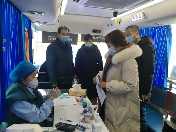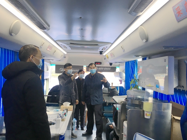 1月29日,省血液中心党委书记岳立宏、副书记刘伟峰、副主任李建斌、张淑琴等奔赴市区各献血屋及献血车停靠点看望、慰问献血者和工作人员,了解无偿献血情况,检查人员防护措施、献血场所消杀灭菌措施落实等情况。